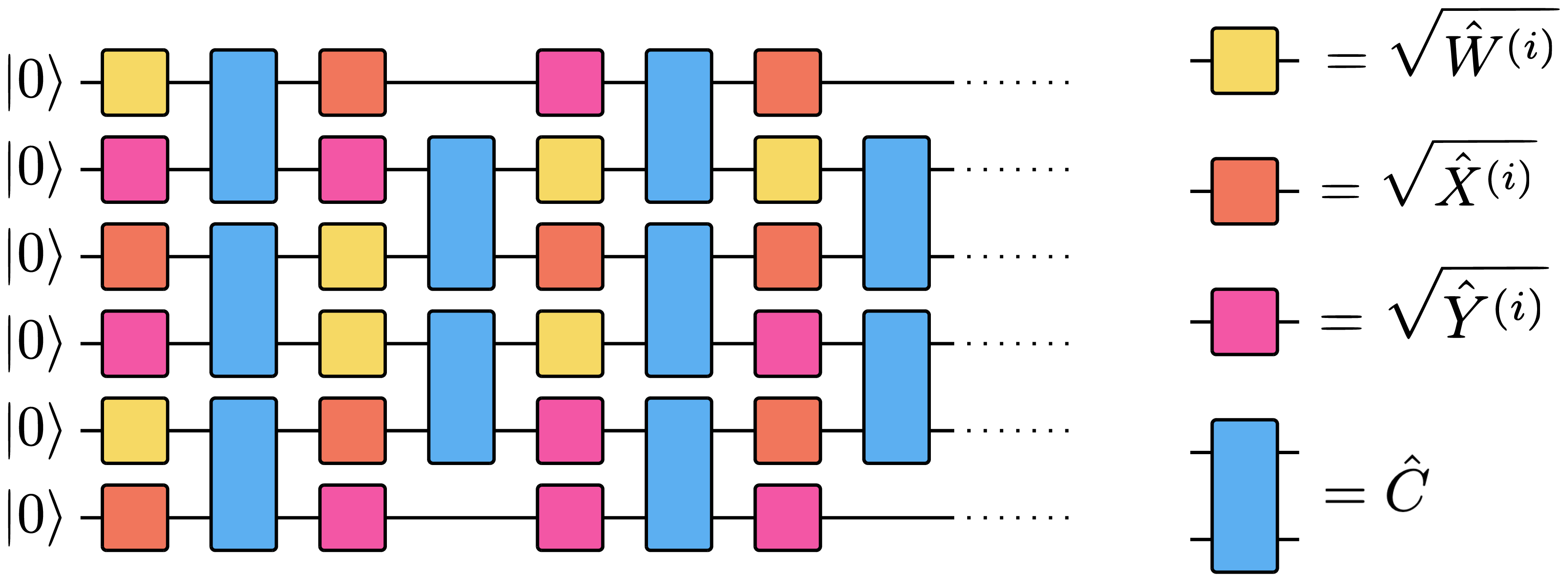 The random component in this circuit is the placement of single qubit gates, which are randomly drawn from the set \(\{\sqrt{\hat W},\sqrt{\hat X}, \sqrt{\hat Y}\}\). These gates are defined by \[\begin{aligned} \sqrt{\hat W}=\frac{1}{\sqrt2}\begin{pmatrix}1&-\sqrt{i}\\\sqrt{i}&1\end{pmatrix} \ ,\quad \sqrt{\hat X}=\frac{1}{\sqrt2}\begin{pmatrix}1&-i\\-i&1\end{pmatrix} \ ,\quad \sqrt{\hat Y}=\frac{1}{\sqrt2}\begin{pmatrix}1&-1\\1&1\end{pmatrix} \end{aligned}\qquad{(31)}\] The layers of randomly selected single qubit gates is interleaved by layers of two qubit gates. The qubit gate used is \[\begin{aligned} \hat C= \begin{pmatrix} 1&0&0&0\\ 0&0&-i&0\\ 0&-i&0&0\\ 0&0&0&e^{-i\pi/6} \end{pmatrix} \ . \end{aligned}\qquad{(32)}\] The placement of the two-qubit gates will in a real experiment depend on the layout of the quantum chip. On a superconducting quantum computer entangling operations can only be applied to neighboring qubits that are connected through some resonator. This means that any two qubit gate that acts on non-neighboring qubits have to be implemented by swapping the states of physical qubits until the computational qubit states of interest are located in neighboring physical qubits. This quickly renders the circuits very deep and impedes performance on current devices. Therefore, the circuits considered to demonstrate “quantum advantage” only work with entangling gates between physically neighboring quibts. Here, we are assuming a linear arrangement of the qubits. The \(\hat C\) gates are applied in an alternating fashion on the even and odd links between the qubits.